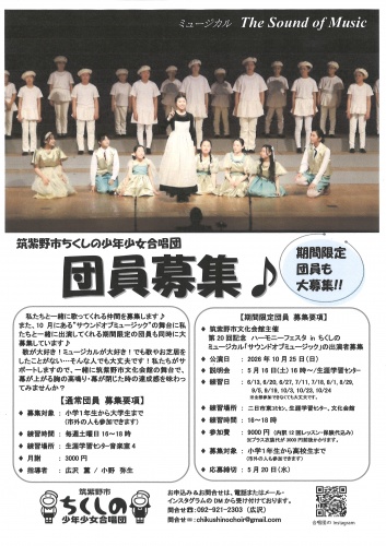 ♪ この公演に出演する「筑紫野市ちくしの少年少女合唱団」がミュージカル“サウンド オブ ミュージック”に出演する仲間(小学1年生~高校生)を期間限定で募集しています。歌うことが好きなア・ナ・タ! 大きな舞台で歌ってみませんか。5月16日(土)の説明会を聞いてから決めても間に合うよ!! 詳細は、添付の「団員募集チラシ」、「その他」の欄をご覧ください。