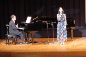 まずは笑顔で入場された紺野さんと塩入さんによる軽快なトークから始まり、笑い声があふれる賑やかな雰囲気になったところで、塩入さんがオリジナルのピアノ曲「夢のしずく」を披露。夏の暑さを忘れさせてくれるような美しい旋律に、会場のお客様から盛んな拍手が贈られました。