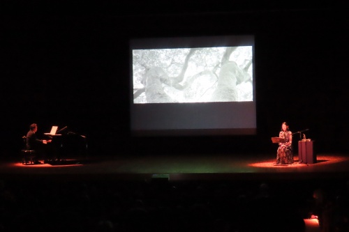 その後、暗転したステージに映し出される悲しくも美しいオリジナル映像と、即興のピアノ演奏に合わせて紺野さんの優しい語り口で朗読が始まると、戦争で我が子に先立たれた母親の悲しみが込められた手記の内容に、涙を拭うお客様の姿も多く見受けられました。